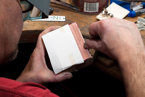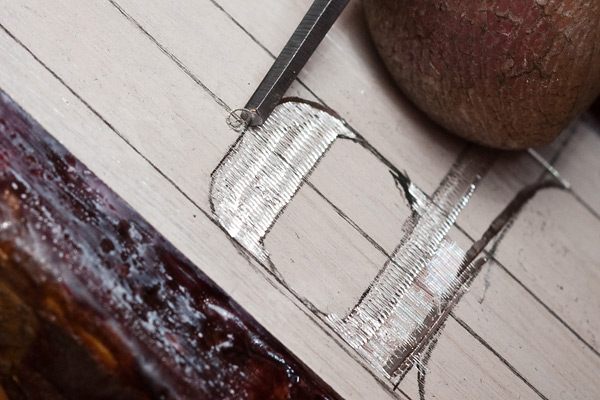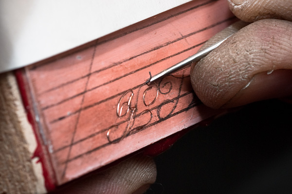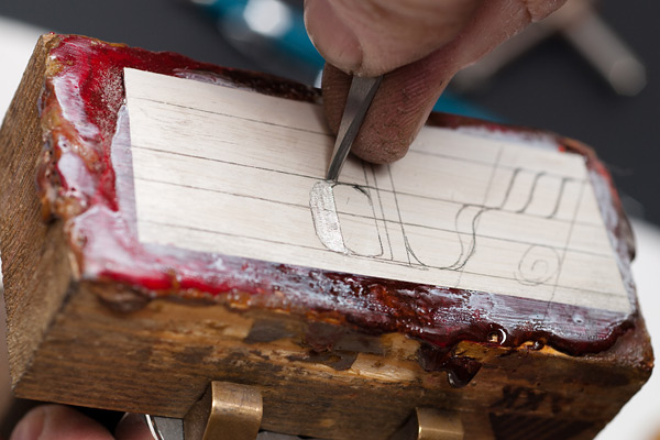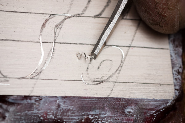 Kaarevat viivat painotuksineen tehdään viistekaivertimella.