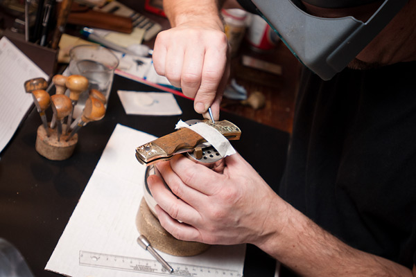 Kääntöveitsen koristelukaiverrusta. Materiaali on messinkiä.